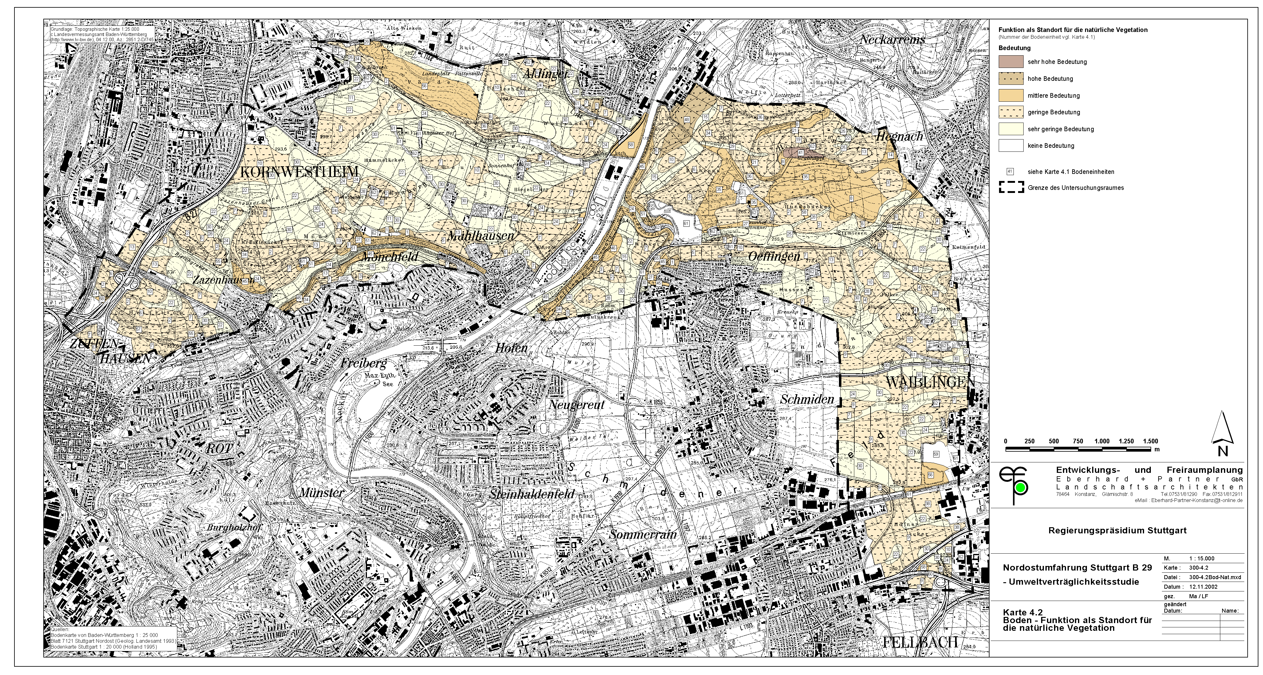 Nach der Beurteilungsmatrix von Reck & Kaule (1993: 76) sind bei erheblichen Beeinträchtigungen von Flächen der Wertstufe 8 (überregional/landesweit bedeutsam) und der fachlichen Beurteilung des Eingriffs als nicht ausgleichbar die Konflikte als sehr hoch und der Eingriff als nicht vertretbar einzustufen.